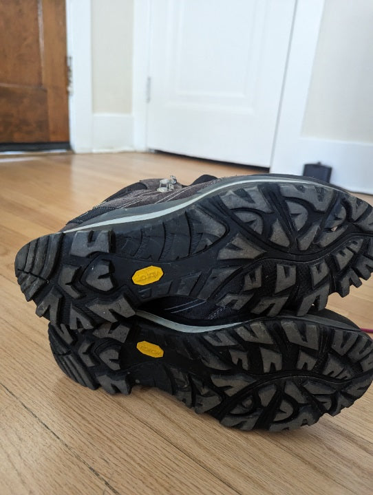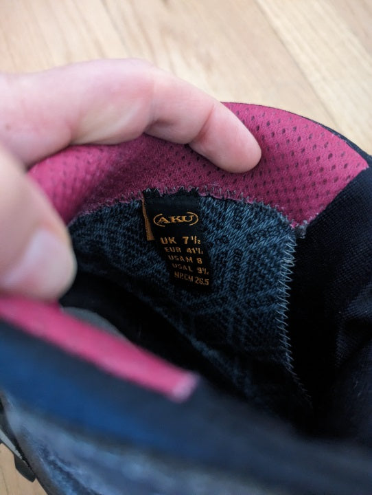 Size 9.5 women's hiking boots.Aku Alterra GTX model.Great condition with maybe 75 miles on the soles.Vibram soles, water proof, and higher ankle support.No major damage or concerns.